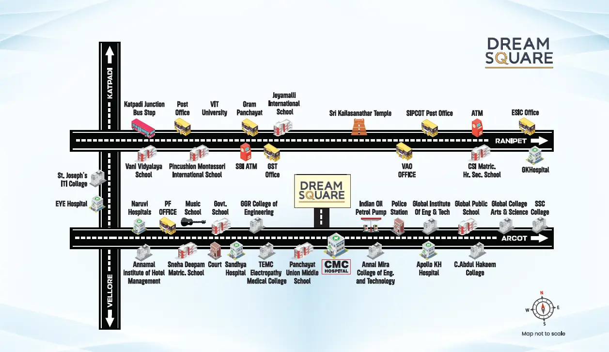 Dream Square Vellore is ideal for families, medical professionals, investors, and NRIs who are looking for safe investment, peaceful living, and long-term appreciation. With excellent connectivity and strong infrastructure growth, this location ensures both comfort and value.