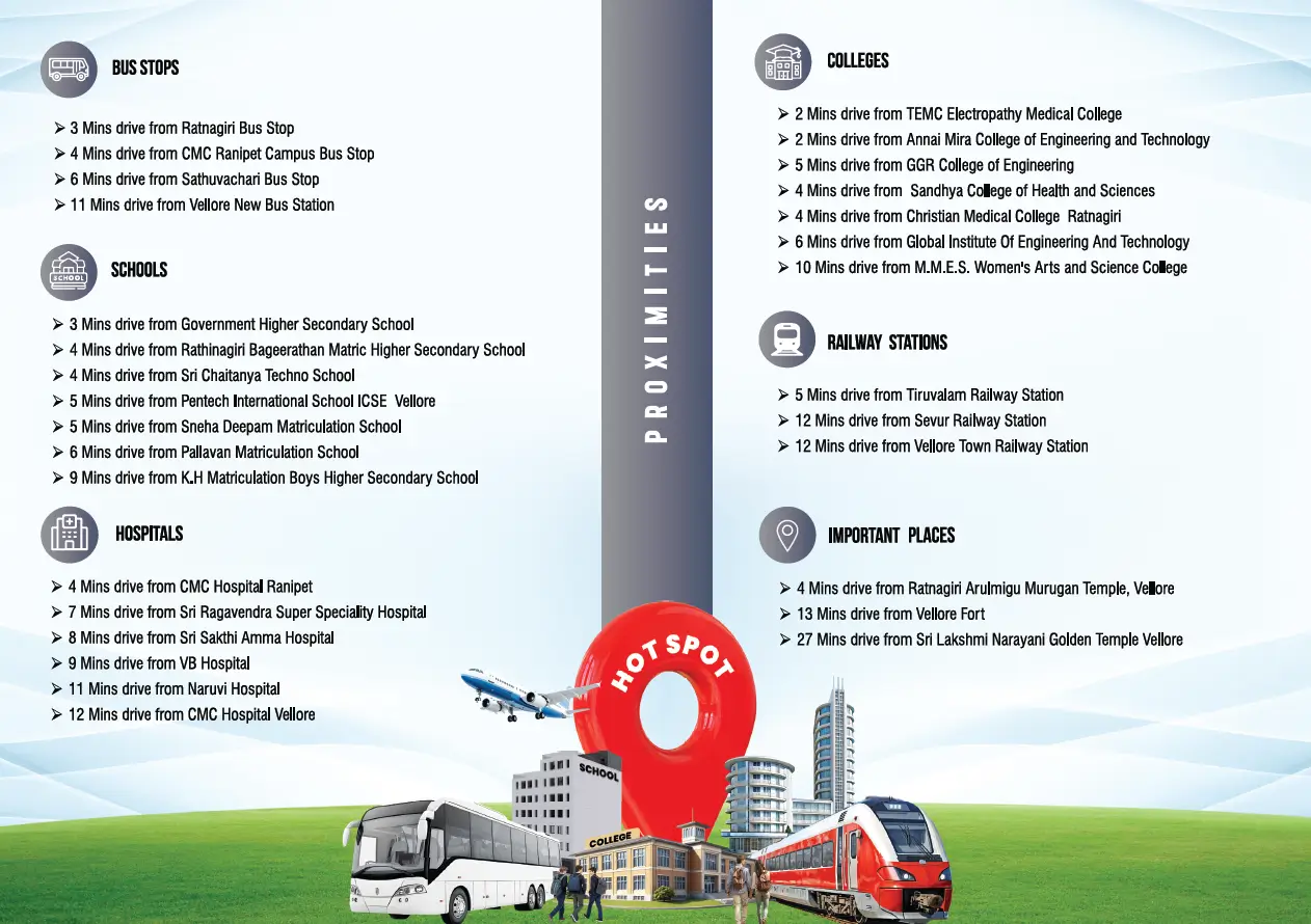 The project is strategically located opposite the New CMC Hospital, Arapakkam, offering unmatched convenience. This prime healthcare-driven location is one of the most demanded residential zones in Vellore.